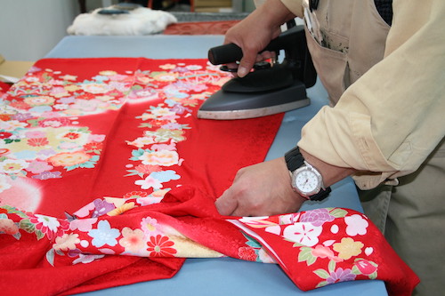 仕上げは、専用のスチームアイロンと余分な蒸気を吸い込むアイロン台で、着物のシワをアイロンで浮かせ、最少の蒸気で伸ばしながら、ふっくらと仕上げていきます。